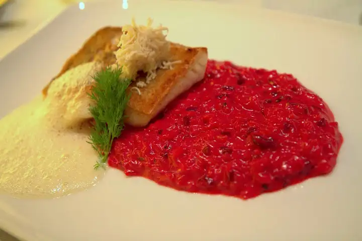 Though I’m a crawfish (crayfish in Europe) fan, a crayfish and cauliflower salad accented by saffron (17 Euros) nested in iceberg lettuce fell a little flat. Not so with vibrant grilled pike perch (23 Euros) on a vividly purple-red beetroot risotto with freshly shaved horseradish on top.