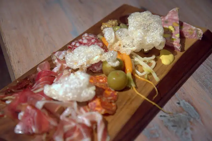 House charcuterie platter ($16) – all meats & pates made in house except for the speck – with house beef tendon chicharrones and pickled vegetables and pickled Persian plums
