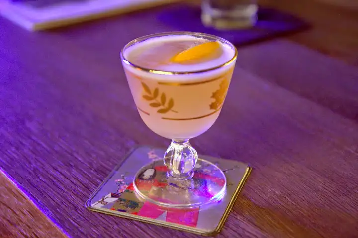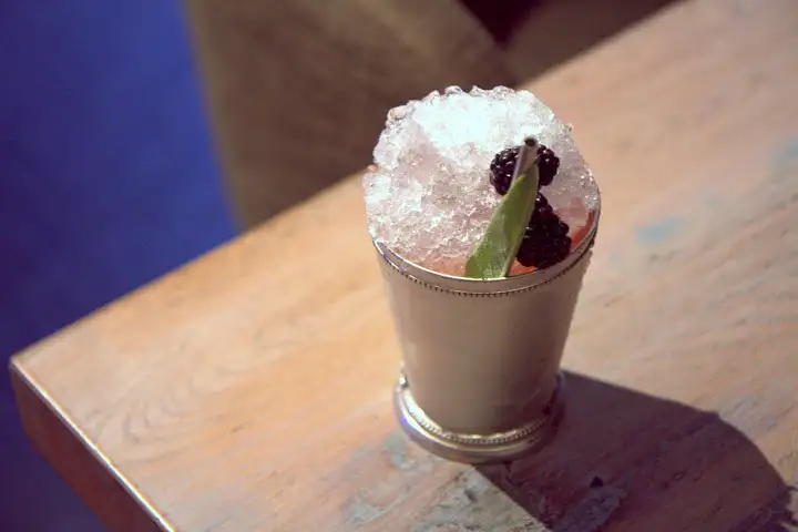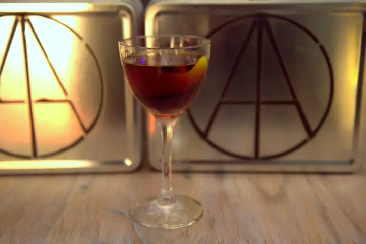 Another favorite, Wink & A Nod ($12), mixes Bulleit Rye Whiskey, Cynar (Italian artichoke liqueur), Galliano Ristretto (Italian coffee liqueur), Fernet BrancaMenta (Italian herbal mint liqueur) – notes of rye bread, chocolate, mint, bitter herbal notes, espresso