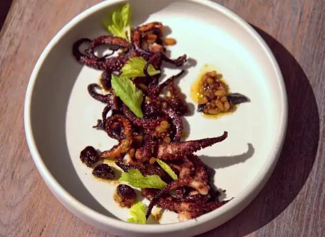 Another brilliant dish ($16): octopus – some of it tender, other tentacles are crispy confit-style – eggplant, pine nuts, cherries