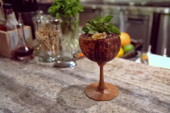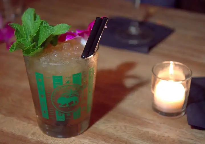 Longitude opened this summer in downtown Oakland, an oasis of tropical design with elegant Tiki and rum cocktails partnered with pupu platters. Behind covered windows wrapped in vintage maps lies an otherworldly space that feels like Africa-meets-Polynesia circa 1930s, with plenty of green, bamboo, palms, mounted wall masks and artwork — much of it collected personally by owner Suzanne Long — from Indonesia to Africa. A fantastic exotica soundtrack transports in Polynesian-Tiki style with refined, rum-centric cocktails.