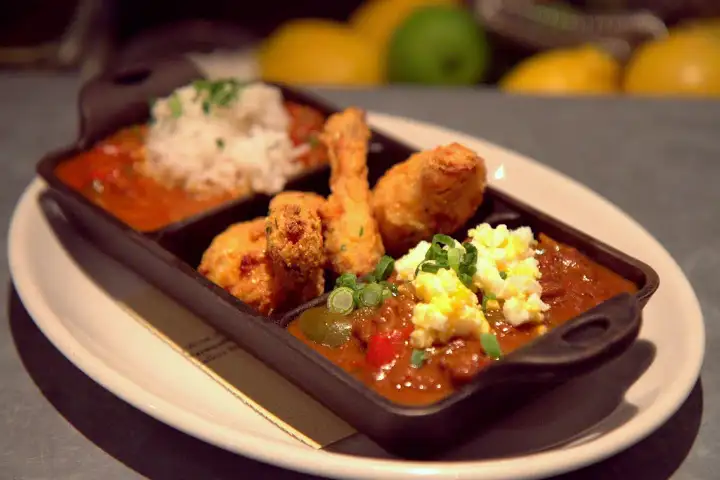 From the day it opened, I appreciated the authentic New Orleans leanings of chef Justin Simoneaux’s cooking at Boxing Room, as well as the craft beer and wine list. But the thing missing was classic Nola cocktails. No more. And with the addition of the new bar, there is also an updated food menu with highlights that include Oysters Simoneaux (more on that here). The most playful — and comprehensive — new menu addition is “Taste of the Swamp” ($18.50), a delightful journey to New Orleans via some of its classic greats: turtle soup and alligator sauce piquant centered by a mini pile of fried frogs’ legs. More on the food and brand new cocktail program in my First Look at Zagat here.