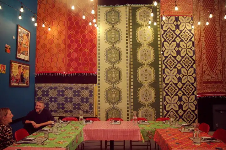 While I like Michelin-starred Commis, James Syhabout’s Hawker Fare in Oakland had disappointed me from day one (as did his short-lived Box & Bells), although I hear Hawker Oakland has updated in line with the new SF locale. But the new Hawker Fare in SF, while certainly with uneven moments/dishes, is a different story. The festive air, brightly covered communal tables, strung white lights, pressed tin “roof” over the bar and kitschy albums and wall artwork (Elvis in Thai!) immediately charm.