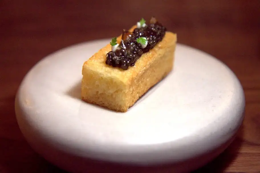 At Mourad Lahlou’s chic new Mourad, there are a few “wow” moments and I have narrowed them down to three. On the pricey ($150) but memorable tasting menu, Caspian caviar on a smoked brioche accented by maple and marcona almonds (and brilliantly paired with sake) is a briny, buttery, smoky, sweet thrill. Also on the tasting menu, applewood-smoked ?ra king salmon (the “kobe” of salmon) is stunning in a Meyer lemon glaze, accompanied by pickled cucumber, dill, potato, cranberry and mussels cream. On the regular menu, the duck liver ($20 – pictured top) is a showstopper and could easily be dessert. Duck liver artfully and delicately melds with layers of pistachio genoise, dark chocolate, turnip and bright satsumas. More on Mourad highlights from the tasting menu and regular menu in my Zagat feature here.