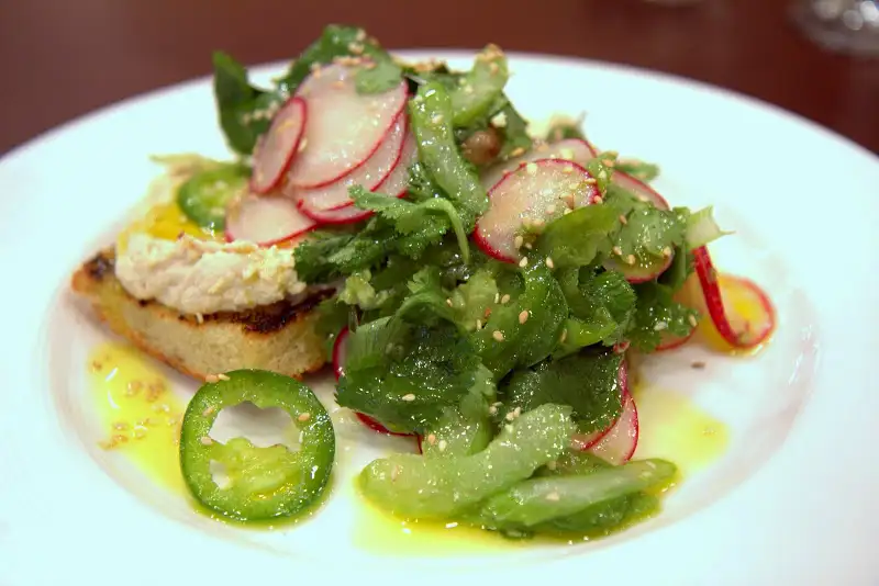 This not just another hummus dish. In fact, Wilcox’ hummus ($12) easily signifies what is in store dining here. Hummus on grilled toasts feels both Middle Eastern and Californian at the same time, bright with jalapeno and cilantro, radishes and sunchokes. It’s an immediate standout.