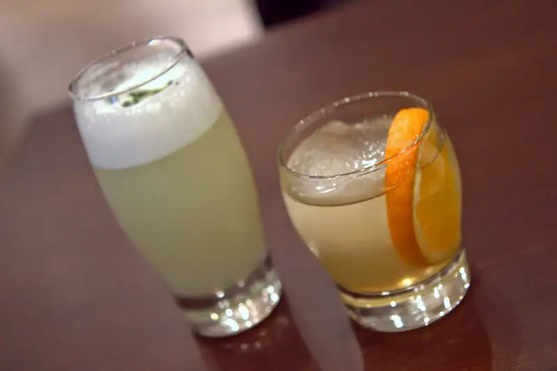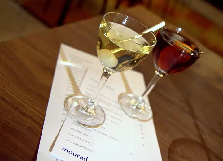 At Mourad Lahlou’s elegant new downtown restaurant, Mourad, cocktails ($13) are straightforward but elegant, created by Christ Aivaliotis and Troy Bayless of Wizard Oil Co. and the new Hawker Fare and Holy Mountain. Though straightforward, the drinks are well crafted and pleasing, whether On the Spot (rye whiskey, Nocino – aka walnut liqueur, Manzanilla sherry and Triple Sec orange liqueur) for the rich, nutty, bracing side of things, or — my favorite — a lovely Capa Gibson, a twist on a classic Gibson cocktail, mixing Sipsmith Gin, French (dry/white) vermouth and Breckenridge bitters with the savory pop of a pickled onion garnish.