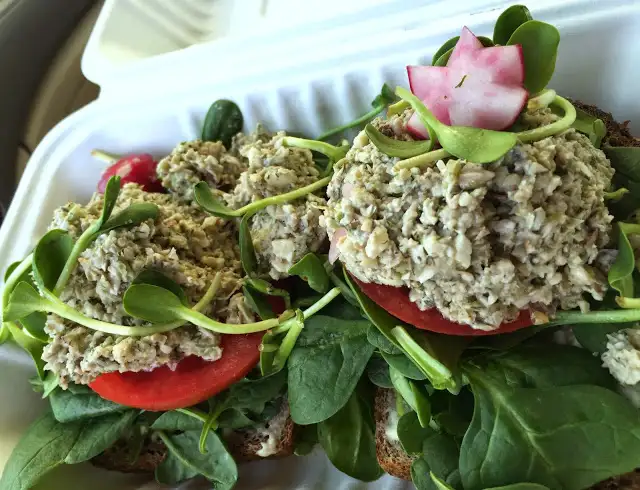 A faux nut “tuna” (sunflower seeds, celery, onions, almonds) is an early favorite, either as a salad ($14) or open-faced sandwich ($12) on rustic, hearty bread with lettuce and tomatoes. Smoothies ($8-9), like Baker Beach Banana Chocolate (banana, cacao, almond butter, dates, almond milk, vanilla), or toasts ($4 each) topped with adzuki bean miso, radishes and flax oil, are other immediate go-tos that leave me satiated.