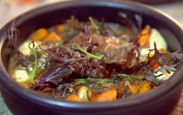 This stunner of a crudo dish ($14) shows off silken scallops from Hokkaido, Japan (which you can also order solo for $5.75). Archuleta pairs raw scallops with kombu (edible kelp) pickle purée and house-cured salmon roe. It exhibits both clean flavors contrasted by umami complexity, wrapped in sheets of nori (seaweed)… like a raw scallop nori taco.