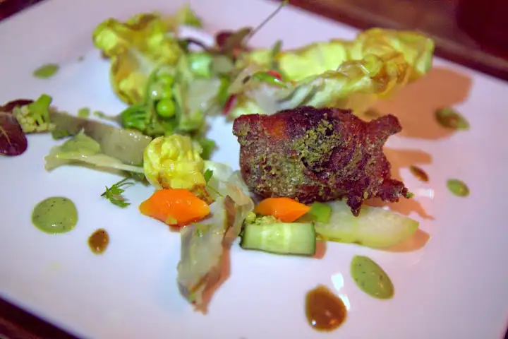 My favorite course during the dinner was Rotondo’s nettle & Bloomsdale spinach beignets, dotted with candied lemon and mouth-meltingly good. The crazy part was how gratifying and fluffy the beignets were though filled with spinach. “Healthy” beignets — who knew? The dish was artfully arranged with garden vegetables (cucumber, Bibb lettuce, rhubarb, lovage, snap peas), marked by nettle dust and coffee-infused tarragon yogurt puree.