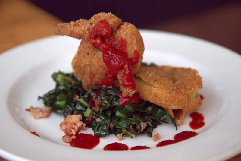 Sightglass Coffee-infused BBQ quail ($12) is easily the most fun dish on the menu. The crispy-fried quail is stuffed with house chorizo mac ‘n’ cheese over a bed of pancetta and kale, partnered with a fried green tomato. “Bicycle sauce,” a house Sriracha-style sauce, perks up the dish with a splash of red and heat.