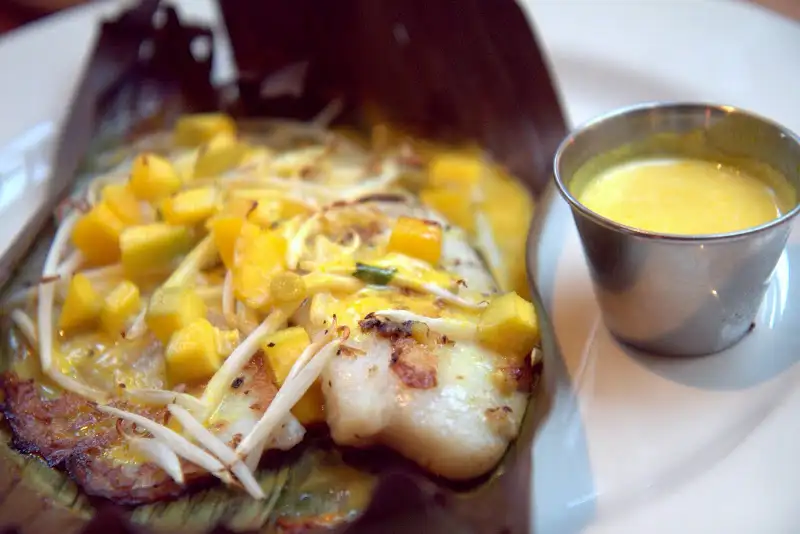 Cozy, Brazilian neighborhood newcomer, Tavares, is the first US outpost of a São Paulo restaurant, located on Potrero Hill. Details on the restaurant here in my Zagat feature article. Tilapia ($16) steamed in a banana leaf is an entree standout. The tender fish is cooked with saffron, topped with mango and accompanied by a dreamy coconut sauce, managing to taste both light and luxurious — like vacation. The fish is paired with a traditional Brazilian pupunha salad: fresh hearts of palm mingling with red onions, tomatoes, parsley and cilantro.