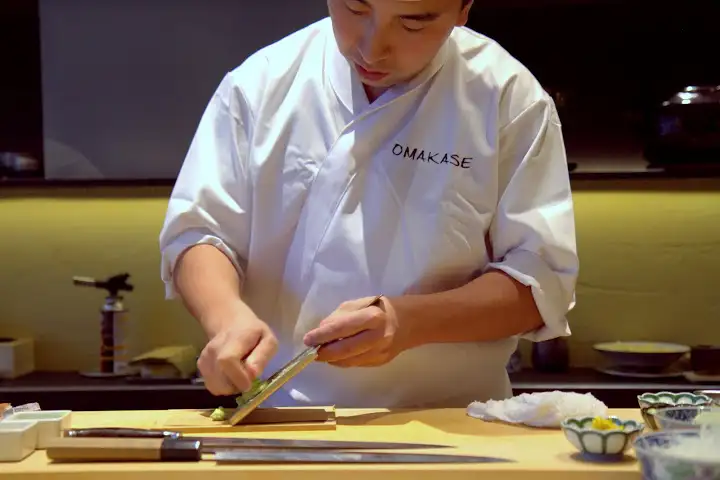Chef Jackson Yu grating fresh wasabi at Omakase