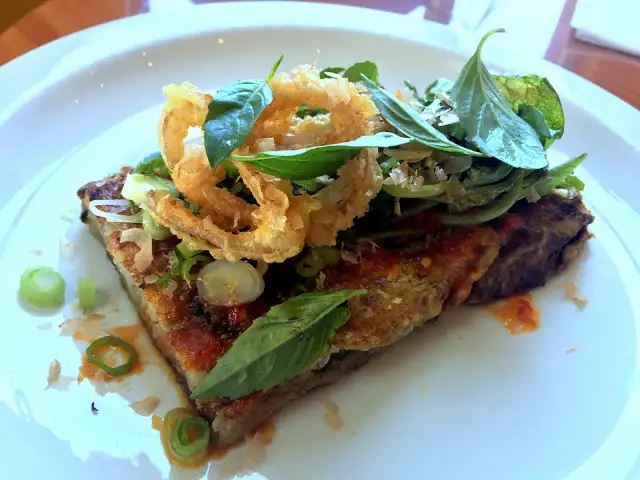 I’m grateful to have a new Filipino food option around the corner from work, Pampalasa. It is now one of my semi-regular takeout spots for lunch in a humble-but-welcoming space off of Folsom. While garlic rice bowls and soups offer savory value, it is a small plate, Tortang Talong  ($9), that surprises. It’s essentially a charred eggplant green garlic omelet drizzled in calamansi lime and soy pandan glaze, garnished with basil leaves and fried onion.