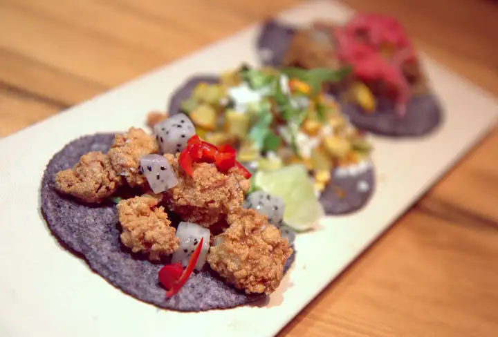 Cut all that cheese with bright, clean ceviche de atun Estilo Jose ($13) — Maggi-lime marinated, line caught yellow fin tuna, dusted in crispy amaranth. Or for an unusual taco, order masa-crusted veal sweetbread tacos ($5) dotted with grilled avocado, red onion escabeche and dragon fruit.