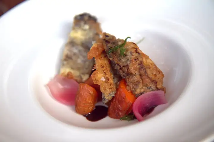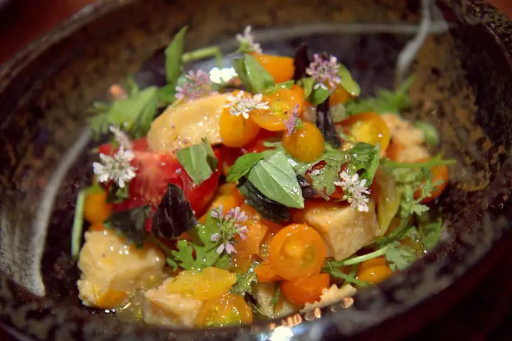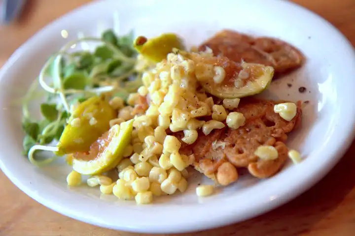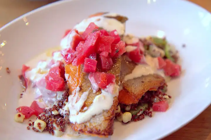 I enjoyed the taste of summer in a starter of Kadota figs, shallots and sweet corn over a socca cake ($12) — an unleavened chickpea flour pancake originating in Genoa, Italy, but typical along the coast of the Ligurian Sea. An entree of sauteed steelhead ($25) was better than many a commonplace fish entree. Fava beans, chioggia beets and (again) sweet corn brought a summery brightness, while the flaky fish with perfectly crispy skin rested over quinoa, with a tahini paste adding texture and richness.