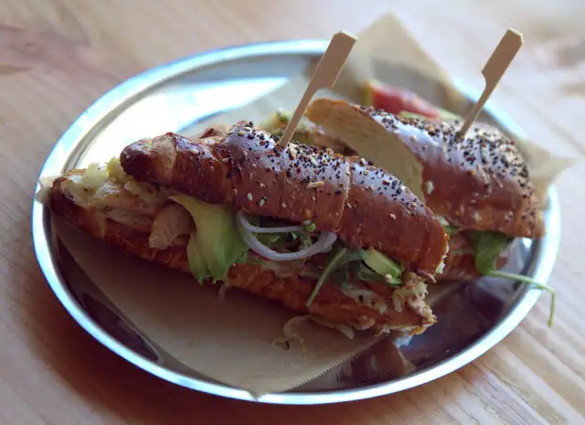 But my top choice initially is cold smoked (also using the house smoker) wild salmon pastrami ($14.72 sandwich/$13.80 salad). Lush wild king salmon mingles with goat cream cheese, avocado, sauerkraut, “tomayo” (mayo-ketchup hybrid), red onion and arugula on fluffy-crisp pretzel croissants from a local German baker. Thoughtful local, Old World-style wines pair well with the high quality sandwiches and salads.