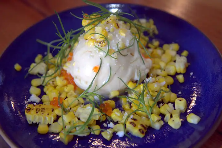 From the team of Jay Porter (of Oakland’s The Half Orange), Luis Abundis (owner of Nieves Cinco de Mayo in SF and Oakland) and Bradford Taylor (of Ordinaire Wine), their long-anticipated restaurant serves “California rustic” fare from executive chef Marcus Krauss (of none other than Restaurant at Meadowood), heavy on California seafood, Pacific Rim and New Baja flavors. Even in soft opening mode, there were a number of moments strong enough to draw me back, from silky black cod tiradito ($17) in yuzu ponzu and serrano peppers that recalled authentic tiradito in Peru, to roasted corn ($12) partnered with Nieves’ sweet hominy ice cream and the salty contrast of trout roe.