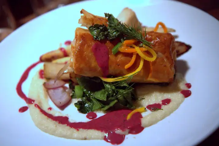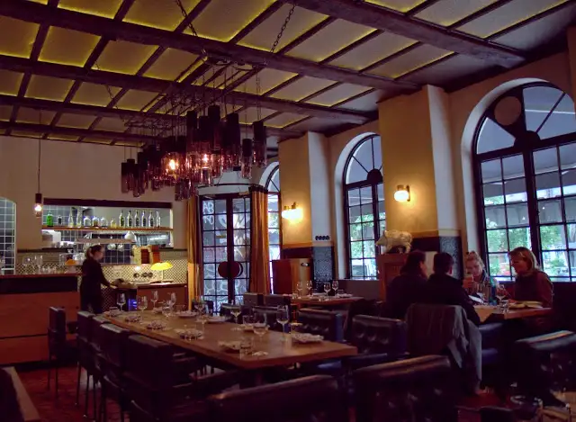 Lokal is the epitome of hipster Berlin with its rustic-chic dining room and good-looking staff set to a fine wine list. The farm-to-table approach hearkens back to the California-created tren, playing off local German foods with modern interpretations… but results are decidedly mixed. Carrot fennel soup (€6) and even spargelfond, aka asparagus (€10), with radishes, cucumber and broccoli in phyllo pastry where rather bland. Roast pork (€19) with carrot, sauerkraut and apple wasn’t exactly exciting but was comforting and well-prepared. Given the raves by locals and critics, I was expecting more, even as I liked the vibe, drink list and ethos.