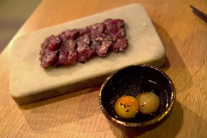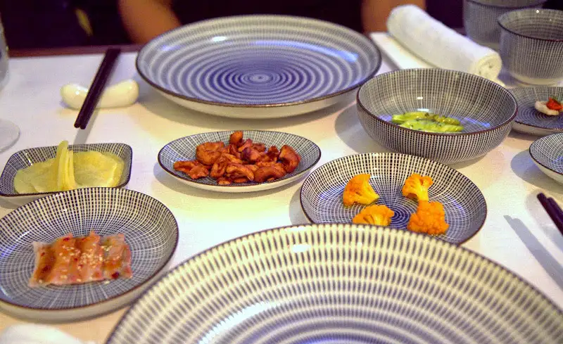 Artful plating and unique expressions of Asian food — predominantly Japanese, Chinese and Korean — Raue expresses an international palate with fine dining precision and superb service, packaged in relaxed casualness. Trying both the regular and the vegetarian tasting menus, standouts abounded, from popular Peking duck three ways utilizing the duck’s heart, stomach and tongue, to lily blossoms soaked in mint vinaigrette. Flavors dazzled with distinction and unexpected combinations. Eight tiny bites to start (think Korean banchan-style amuse bouche) are a highlight, as is dessert, like succulent Périgord strawberries from France in rhubarb jus with Pondicherry peppers.