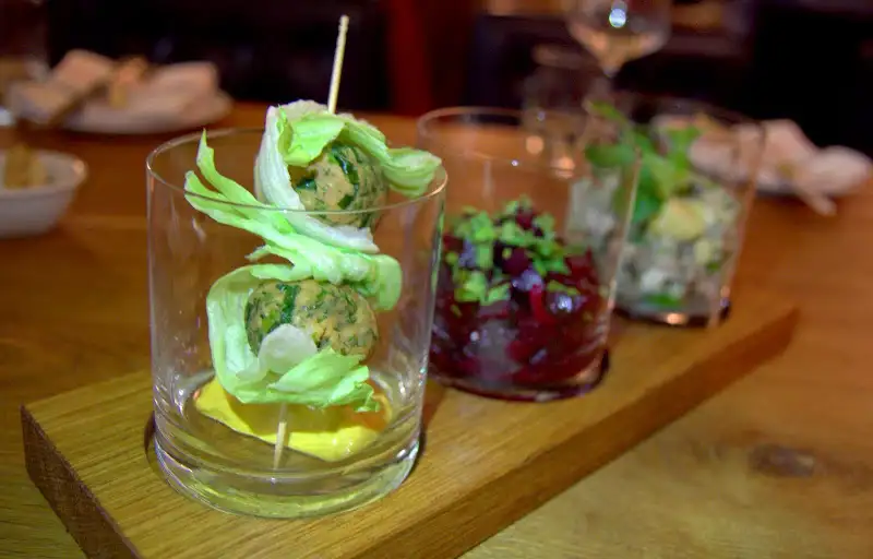 House pumpkin seed and oat bread with salty, green butter is a fine accompaniment to a meal, while lentil balls wrapped in lettuce and dipped in carrot puree (€3.50) makes a fine starter. I loved the combo of dishes offered in glasses, allowing me to try a range of the menu over two visits (3 for €10, 6 for €19, 9 for €28). While green apple and dill-laced herring tartare was dry and disappointing, blood sausage over creamed sauerkraut was downright dreamy. Elderflower cream with pumpernickel and cherry compote (€3.50) was an inspired, not-too-sweet dessert.