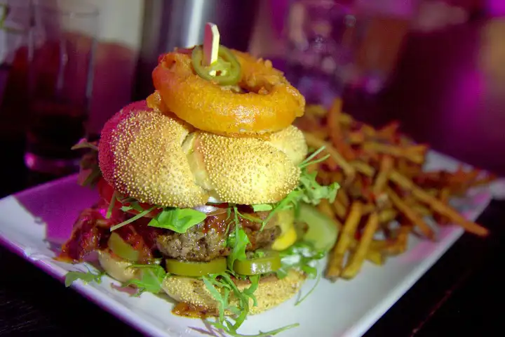 Affordable prices for all international dishes (€4.50-13), including a twist on Peruvian ceviche, pair well with quality beers (like Berlin-based Eschenbräu), wines and schnaps. But, oh, that burger. Juicy beef is piled high with onion rings, arugula, cheddar, bacon and pickles on a brioche bun in a sweet barbecue sauce. One of the more fun meals I had in Berlin.