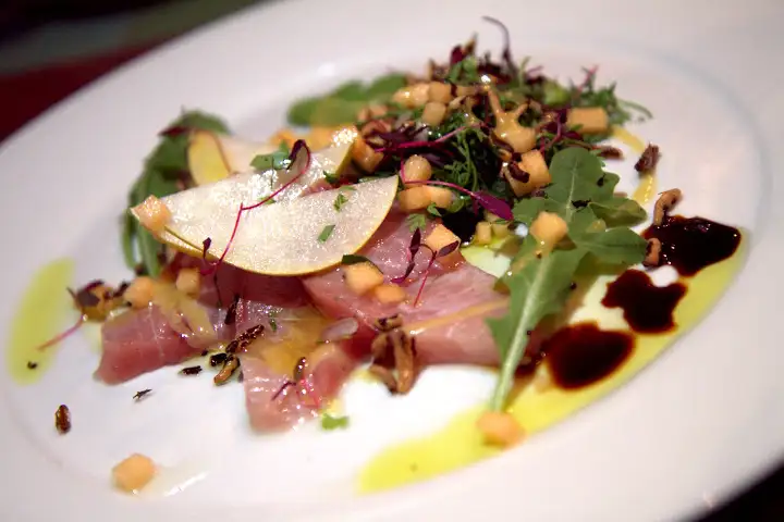 Note the specials — often heavy on fresh seafood — at Big Sur Roadhouse, like a gorgeous yellowtail crudo with Asian pears (pictured) or Marin wild king salmon over saffron risotto. Regular menu highlights include plump, sautéed prawns ($16) on olive oil–fried white bread made in-house, laden with Big Sur heirloom tomatoes and feta cheese (like a glorified, California version of Texas toast) or ridiculously good, free-range chicken ($28) over wild rice, stuffed with macadamia nuts and dried stone fruits in an anise ginger broth. Save room for housemade ice creams in changing flavors like buttered popcorn or lemon poppyseed.