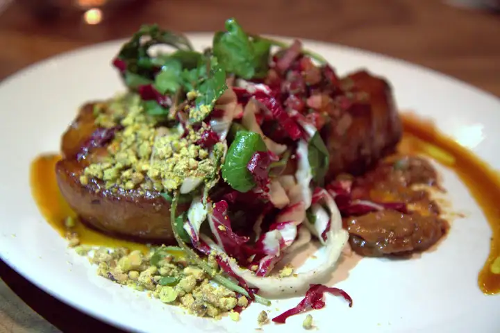 Bluestem has been doing downtown right since day one with organic ingredients, grass-fed meats and responsible whole animal practices. On Banker’s initial menu, there is a changing Devil’s Gulch pork cut each day ($27), in keeping with those laudable practices. During my recent visit, it was a pork chop smothered in pluot salsa verde, stone fruit mostarda and brown butter pistachio crumble. The result was luxurious without being heavy, full of decadent sweet-nutty flavor, the chop tender and pleasantly fatty, tasting of the last days of summer.