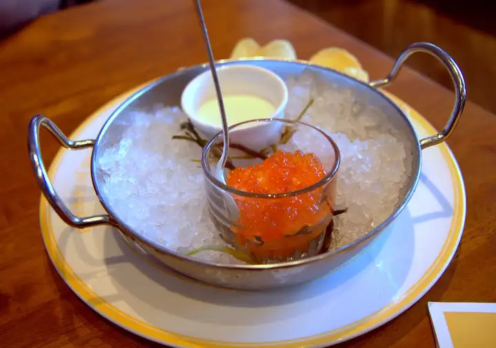 The raw bar is another highlight (ever-changing market prices), whether herb and oil-doused razor clams from Monterey or succulent salmon roe scooped up with creme fraiche and chips. Order a glass of Chablis or Sancerre wines and it’s completely transporting.