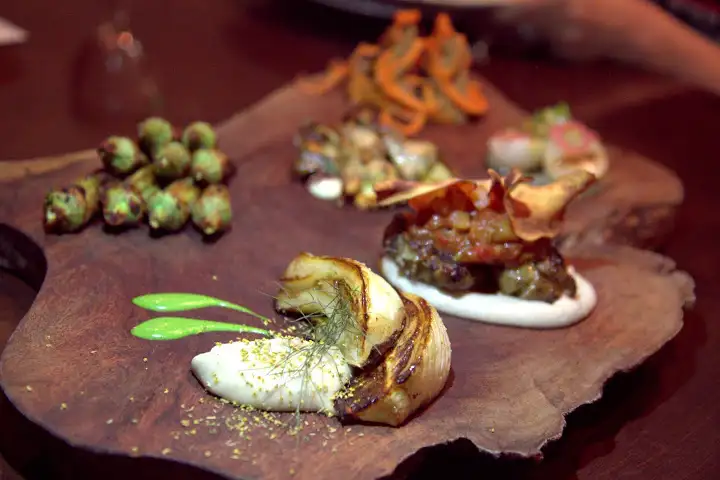 Asian accents are found here and there, as with a Gulf crab starter ($18) marked by avocado crème, green tomato, Vietnamese nuoc cham sauce and crunch from puffed sorghum. The vegetable composition platter ($28), served on a wooden slab, was one of the great dishes, even for us meat-eaters, recalling the vegan “charcuterie” platters Gather did in Berkeley back when they opened in 2009. On my visit, fennel, artichokes and sunchokes all took center stage in creative interpretations.