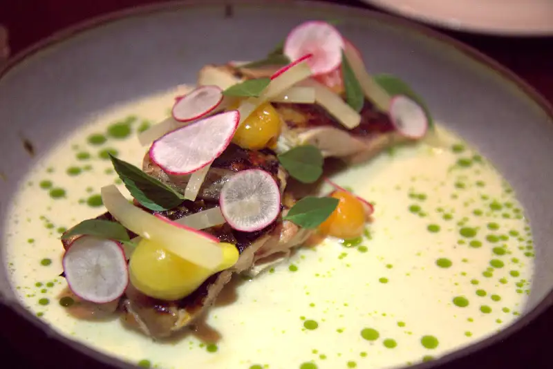 The menu changes regularly but a variation on their Windy Meadows chicken ($34) remains popular for good reason. Thai-inspired in coconut broth and basil oil with tomato and green papaya, it’s an expensive but memorable chicken entree. Ricotta gnocchi ($28) is a dish I love — and have had dozens of times in SF and around the US. McCallister’s rendition dissolves in soft, airy goodness as the best ricotta gnocchi should, accented with fennel and fennel fronds, onions and carrots, decadent in house cultured butter.
