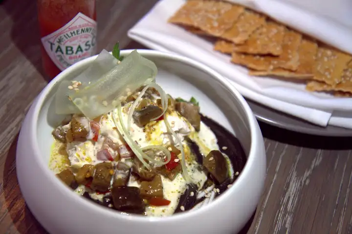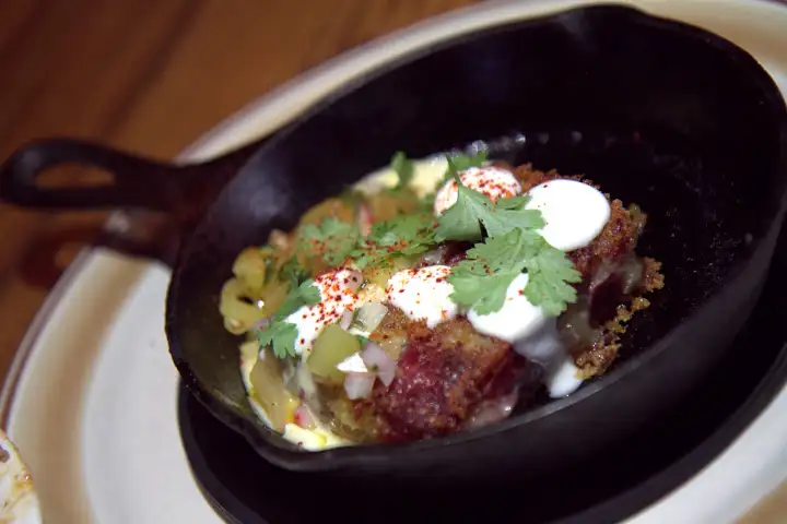 A tamale relleno ($8) is a unique twist: blue corn masa wrapped in a chile relleno, doused in chicharron stew, given sweet-crunchy contrast from raisins and almonds. Cocktails were a bit of a let down (low on the complexity and memorable flavor), while the most gratifying dish was a twice-baked potato ($11), meaty with braised goat, cheesy in cheddar fondue, given a tart kick from green tomato.