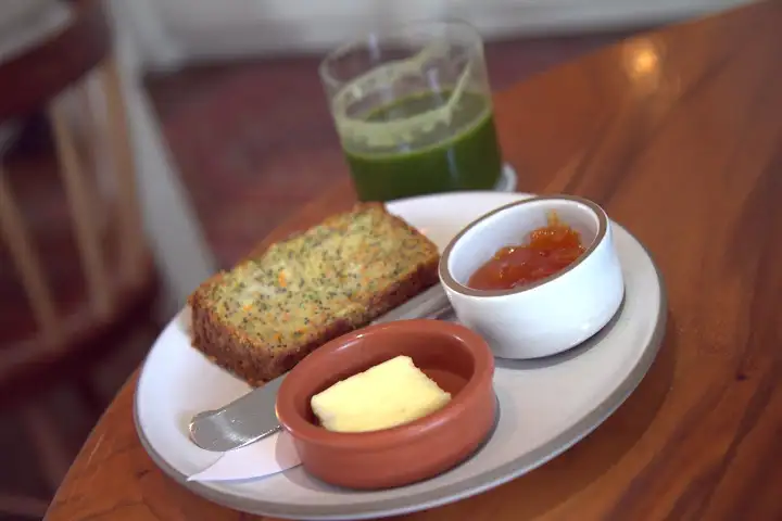 The sister restaurant to Austin upscale classic Jeffrey’s, Josephine House was easily my favorite brunch in Austin. In a charming Clarksville cottage on a residential street, Stumptown coffee and changing fresh juices (I liked greens, cilantro, apple, serrano juice – $7) flow while a cozy patio looked inviting if it weren’t for the nasty heat. Inside, a marble bar showcases fresh baked breads (like carrot zucchini poppy seed bread) and breakfast platters, with the one (big) downside being an abundance of flies hovering over the spread.