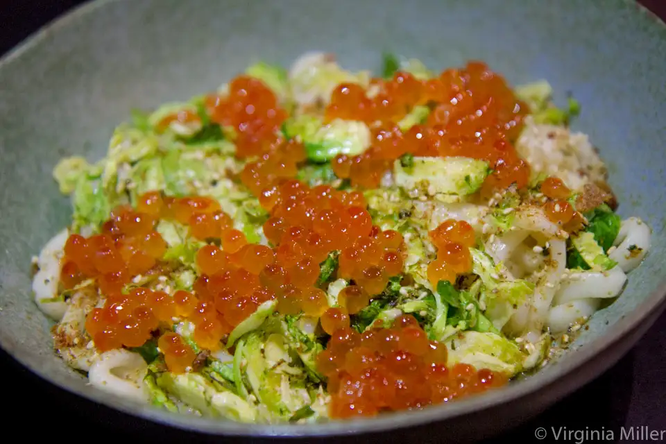 Larger plates stand out, like plump maitake mushroom dumplings ($15) or raw McFarland Springs trout ($17), the latter looking glopped together in presentation but a luxurious, delicious combination of trout contrasted by crispy nori (seaweed) sheets, grilled bok choy, rice and fuyu persimmon. Another pleaser is warm udon noodles ($16), lush with jidori egg yolk and generously covered in brussels sprouts leaves and plump salmon roe. Pink lady apple mochi ($9), accented by almond, cinnamon and tapioca balls, makes for a soothing, clean dessert.