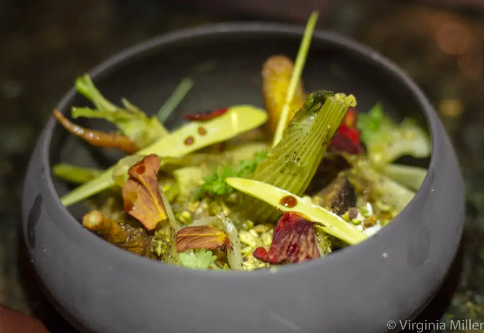 farro, labneh and pistachios dish, given a touch of earth from espresso)