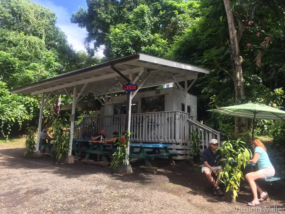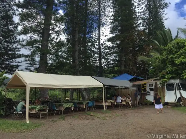Besides Travaasa’s two restaurants (more on those here), there are a range of food trucks in Hana offering the majority of the “dining” options on this entire side of the island. Food truck hours are sporadic, inconvenient (often closing right before dinner time) and not always as listed. You can walk or drive to one only to find it nowhere in sight or completely shut up.
