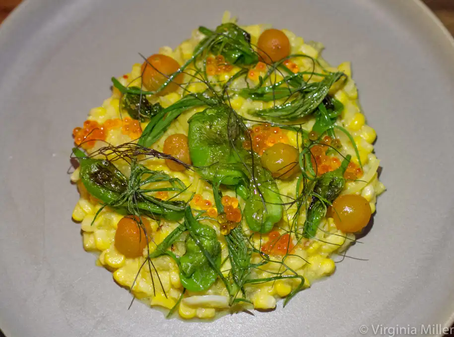 A cool Santa Rosa plum gazpacho ($15) is downright beautiful laced with lemon cucumbers, marcona almonds and dill. His Brentwood corn ($17) dish tastes of the best of summer, standing out from the many Brentwood corn dishes I’ve had this month alone, marked by skinned sungold tomatoes, smoked trout roe and padron peppers.