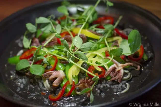 Likewise, local halibut crudo ($18) jumps out from the ubiquitous crudo dish contrasted with nectarines, puffed quinoa, turnips, lemon verbena and Fresno chiles. Elegant comfort is found in Monterey squid porridge ($28) with its base of squid ink koshikari rice graced with spring peas, preserved lemon and Fresno chiles. Brimer’s dishes are colorful as they are delicious.