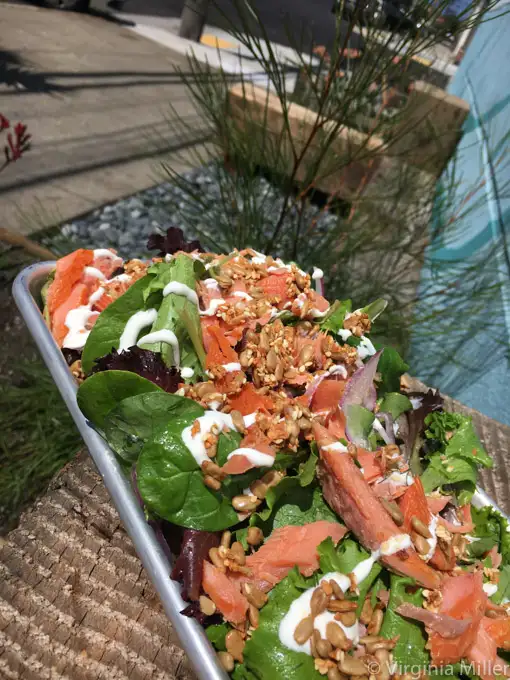 I recently told you about the local seafood goodness of Outer Sunset newcomer, Hook Fish Co., here. If their smoked trout salad is on the ever-changing, catch-of-the-day menu, it’s a filling, healthy mountain of smoked fish over lettuces, shaved vegetables and herbs, drizzled in creme fraiche, vinaigrette and “everything seed” clusters. Contrast, crunch, soft creaminess and subtle smokiness = healthful goodness.