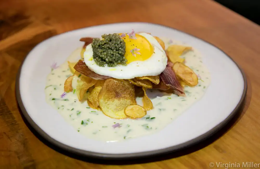 Salads shine, like tomaquet ($14), a perfect expression of summer with heirloom tomatoes and mint-touched compressed watermelon, accented with Pedro Ximenez sherry crema. Ou ($20) is already a house hit: a sunny-side-up egg over little potato chips doused in caviar and Idiazabal cheese crema, salty with slivers of jamon Iberico de bellota. It’s the kind of midnight snack one dreams of with a glass of cava or a salty, briny sherry.