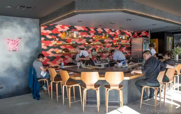 From a hip hop and rock soundtrack to the inlaid penny bathroom floor, the light-filled space screams “cool.” Tan and wood seating, neon pink logo signage, vibrant pink-salmon-black tiles behind the sushi bar and dripping gold resin from ceiling to floor (by artist Caroline Lizagarra)? This is a different kind of omakase experience.