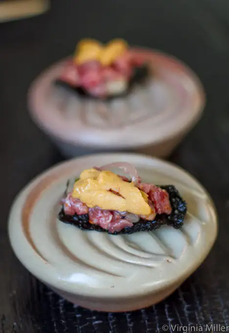 A trio of uni (sea urchin) from Santa Barbara, Mendocino and Hokkaido thrills us uni lovers. As does a comforting bowl of sesame noodles ($18) dusted with shaved black truffle and Japanese chimichurri.