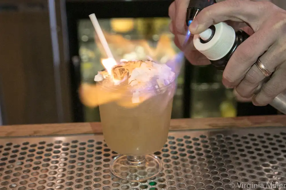 Torching fresh coconut shavings on the Boom Box cocktail at Oakland’s Hello Stranger