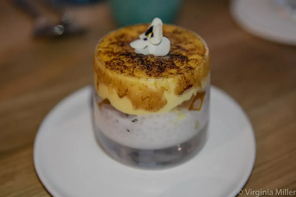 Tropical creamsicle brulee over haupia tapioca with dragonfruit, pineapple, lilikoi sorbet