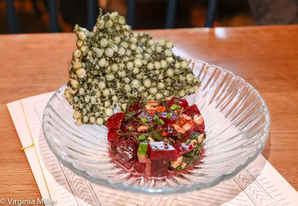 Starters hide standouts like a vibrant masala dal (mung bean lentils, tomato, coconut, kaffir lime) or smart beet poke that recalls proper Hawaiian tuna poke but with beets, macadamia nuts, cucumbers, ponzu and sesame seaweed crackers. Desserts also shine, especially banana whip with red wine-steeped Concord grapes, almond-tahini-cinnamon sauce, toasted coconut and hemp seeds, as do seasonal juices, house shrubs and mocktails.
