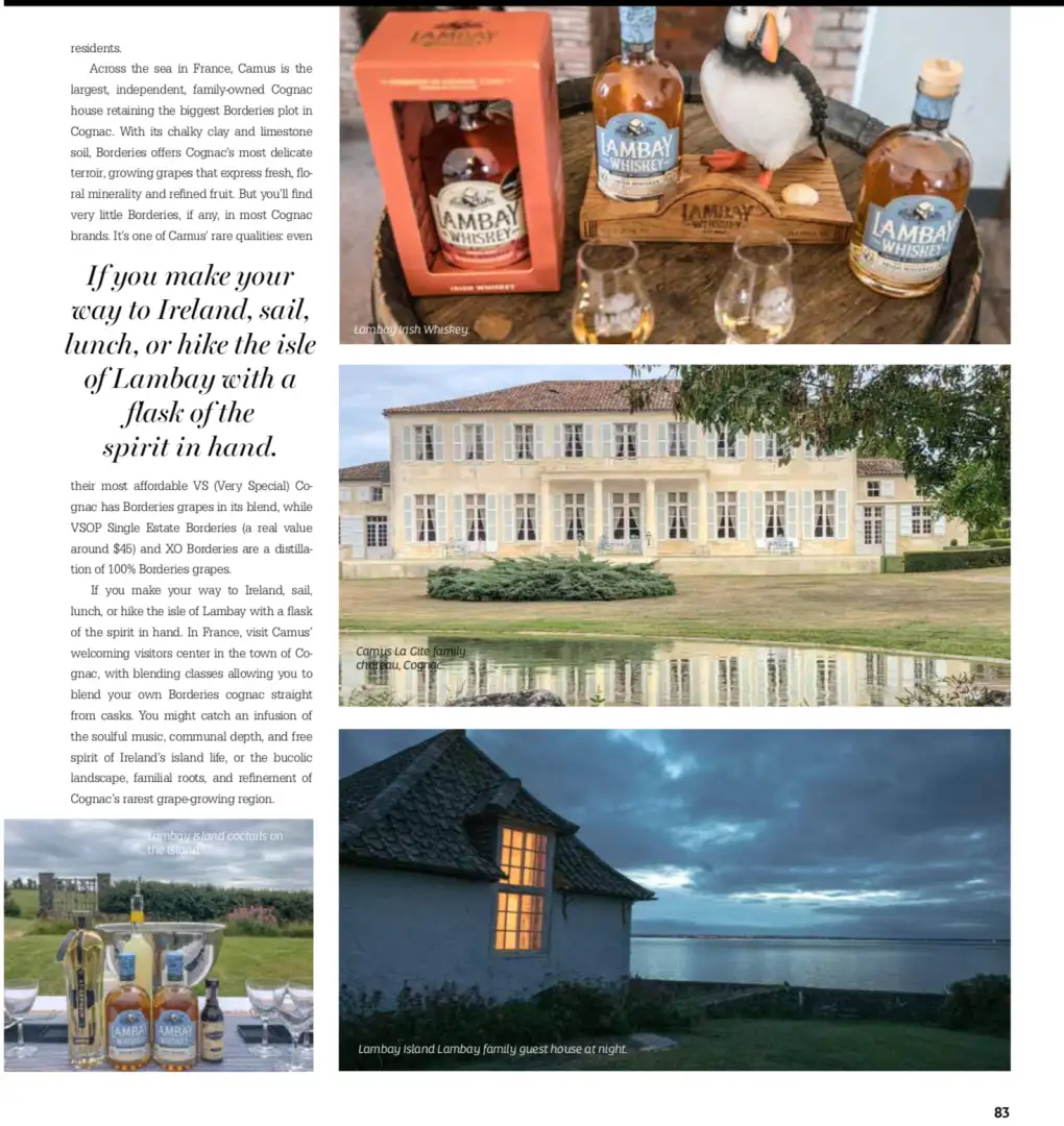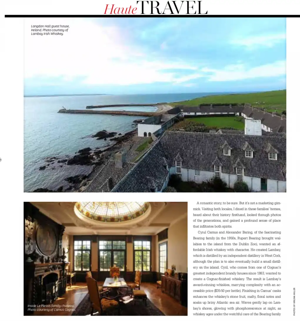Published in my regular print columns at Haute Living Magazine, the November-December 2019 issue includes my feature on travels to Cognac, France (in depth on Cognac — how it’s produced, what the region is like, etc. here), and Lambay Island, Ireland, to explore a unique marriage between Cognac and Irish Whiskey between two spirits families.