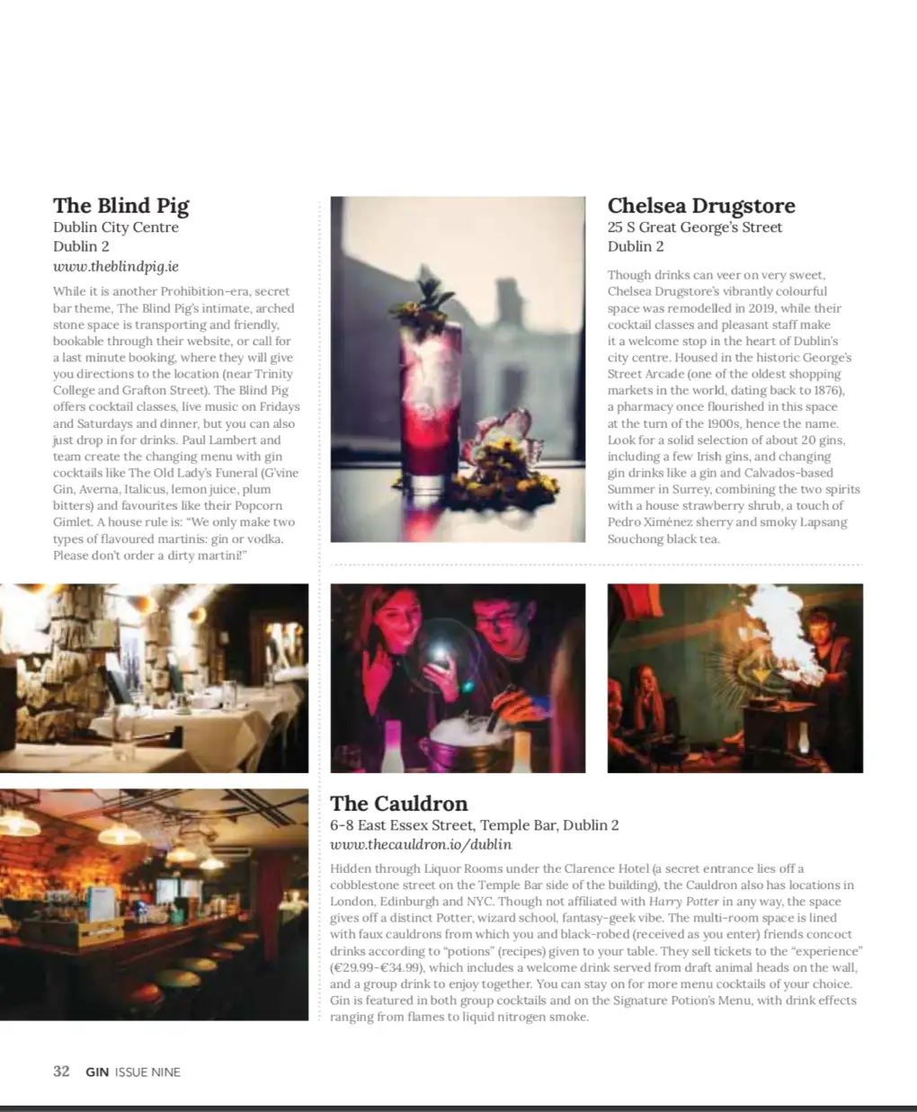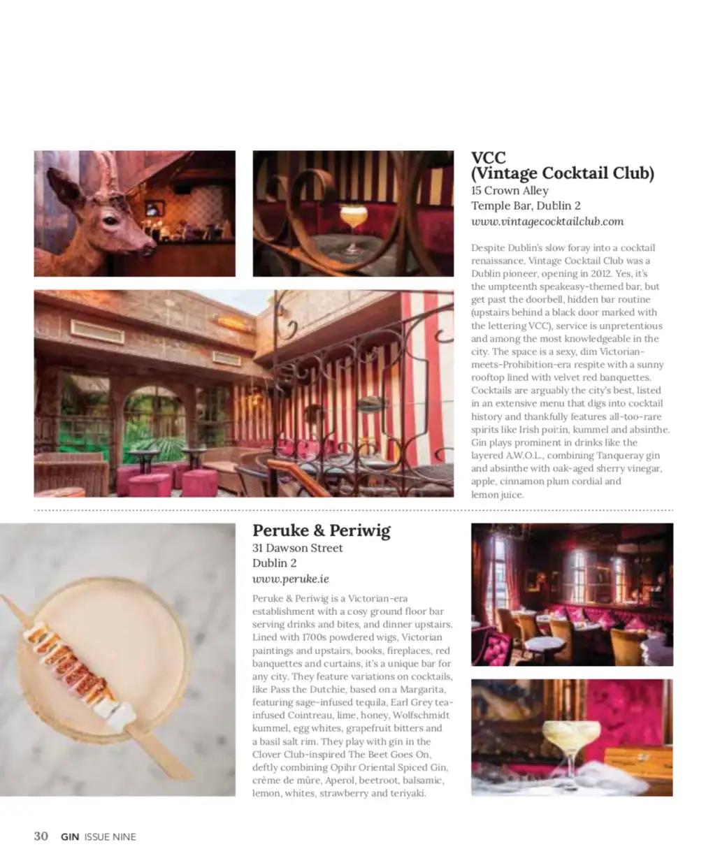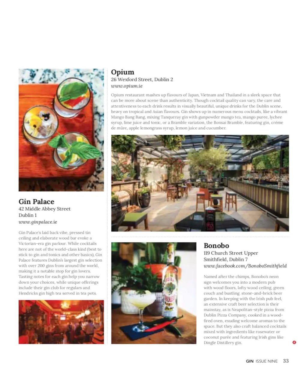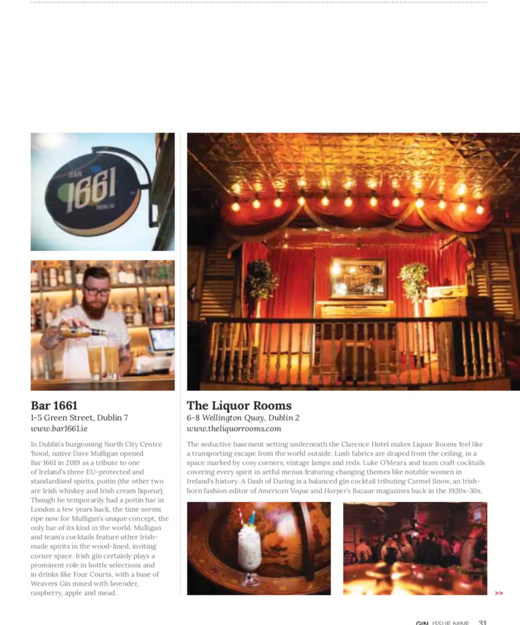 This issue I cover 10 top Dublin bars: Bar 1661, Bonobo, Gin Palace, The Liquor Rooms, The Cauldron, VVC, Chelsea Drugstore, The Blind Pig, Opium, Peruke & Periwig