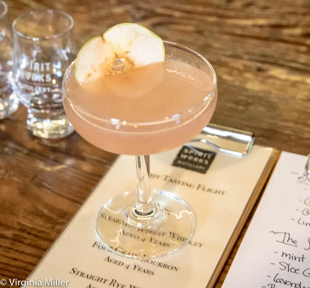 Spirit Works’ Gravenstein gimlet: navy strength gin, grenadine, Gravenstein apple jelly, lime and coriander bitters