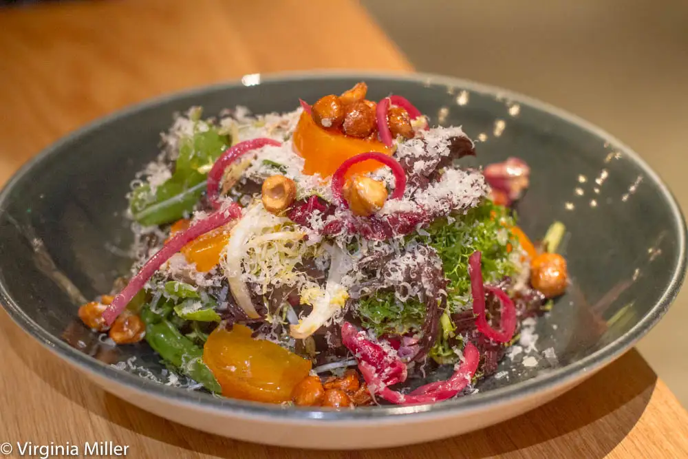 Debuting October 13, 2022, Rosemary and Pine (R&P) opened in the former Skool space on a sleepy block of San Francisco’s Design District, nestled between SoMa, Mission Bay and Potrero Hill. R&P is the latest restaurant from the Omakase Restaurant Group behind the likes of Michelin-starred steakhouse Niku, Michelin-starred sushi spot, Omakase, and Dumpling Time, all three around the corner from R&P. The space is warmer since Skool days, redesigned by Aya Yanagisawa, in neutral tone like a warmer-than-olive green, with a glowing bar and huge asset of a roomy, hidden front patio.
