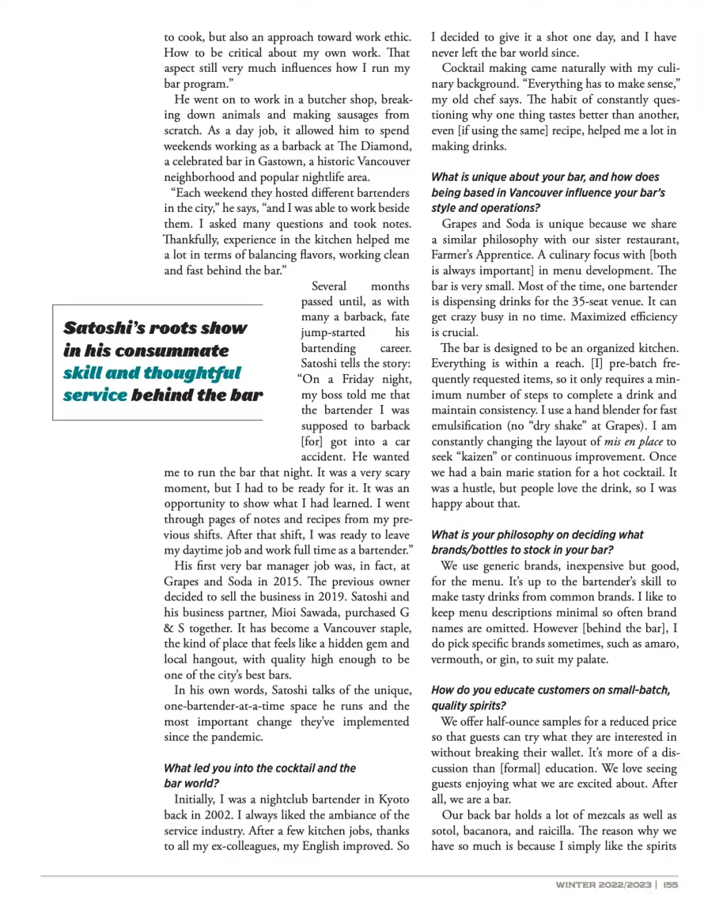 - My interviews with bar manager Satoshi Yonemori of Grapes & Soda here; Alayne & Jason MacIsaac of Sheringham Distillery below and online here
