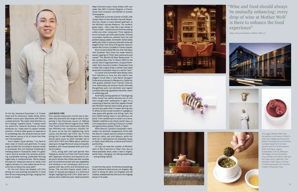Traditionally known for its street food, Los Angeles is now redefining fine dining through visionary chefs and sommeliers who push the boundaries of culinary innovation with sustainable, creative food and wine pairings, writes Virginia Miller: